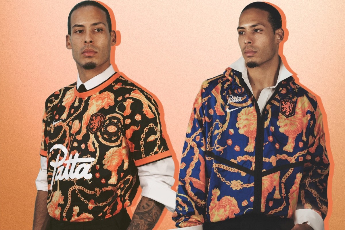 整体设计方面,该系列服饰以深色为主基调,融入橙色雄狮、金色链条等图案元素,并同时结合Patta标志、耐克Swoosh标志以及荷兰国家队队徽,呈现出强烈的视觉风格与文化融合感。